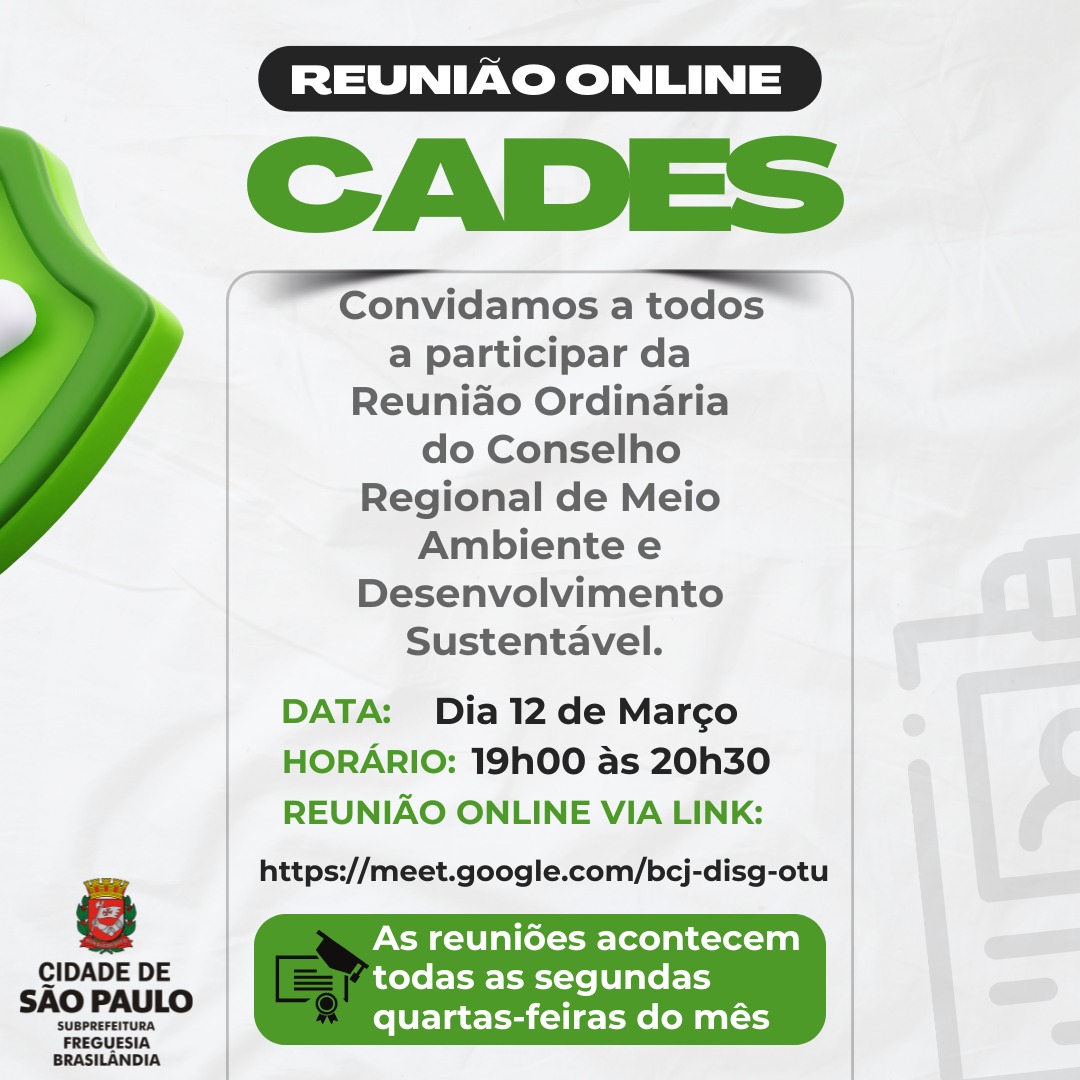 No dia 12 de março, das 19h00 às 20h30, ocorrerá a Reunião Ordinária do Conselho Regional de Meio Ambiente e Desenvolvimento Sustentável (CADES). O encontro será realizado de forma online, e todos estão convidados a participar através do link: https://meet.google.com/bcj-disg-otu