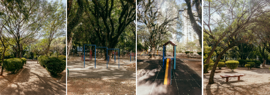 Possui equipamentos de ginástica, áreas de circulação e pista de caminhada com piso intertravado, playground e áreas gramadas para contemplação. Cães são permitidos, desde que circulem com coleiras e guias.