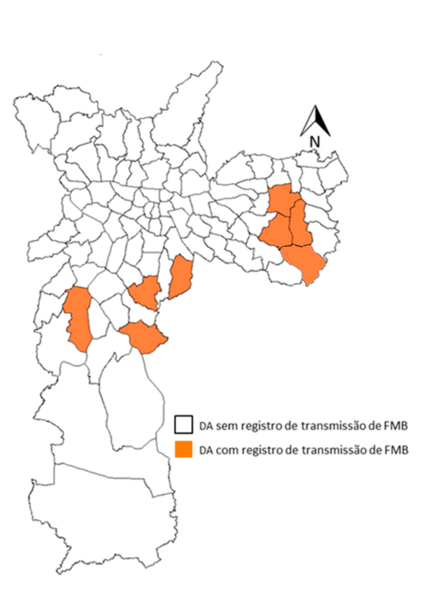 As áreas onde ocorreram transmissão conhecida de FMB no MSP estão apresentadas no mapa a seguir, segundo distritos administrativos: Itaquera, Jabaquara, Jardim São Luiz, José Bonifácio, Pedreira e Sacomã e Parque do Carmo.